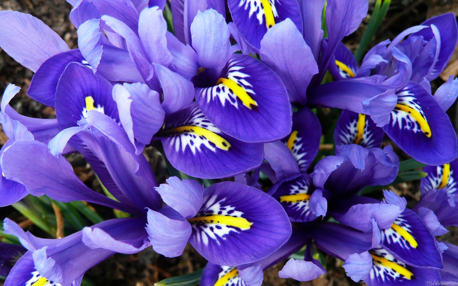 One sign of early spring is miniature irises. (The regular irises don't come until late spring.) Here's a floral wallpaper with miniature blue irises up close.